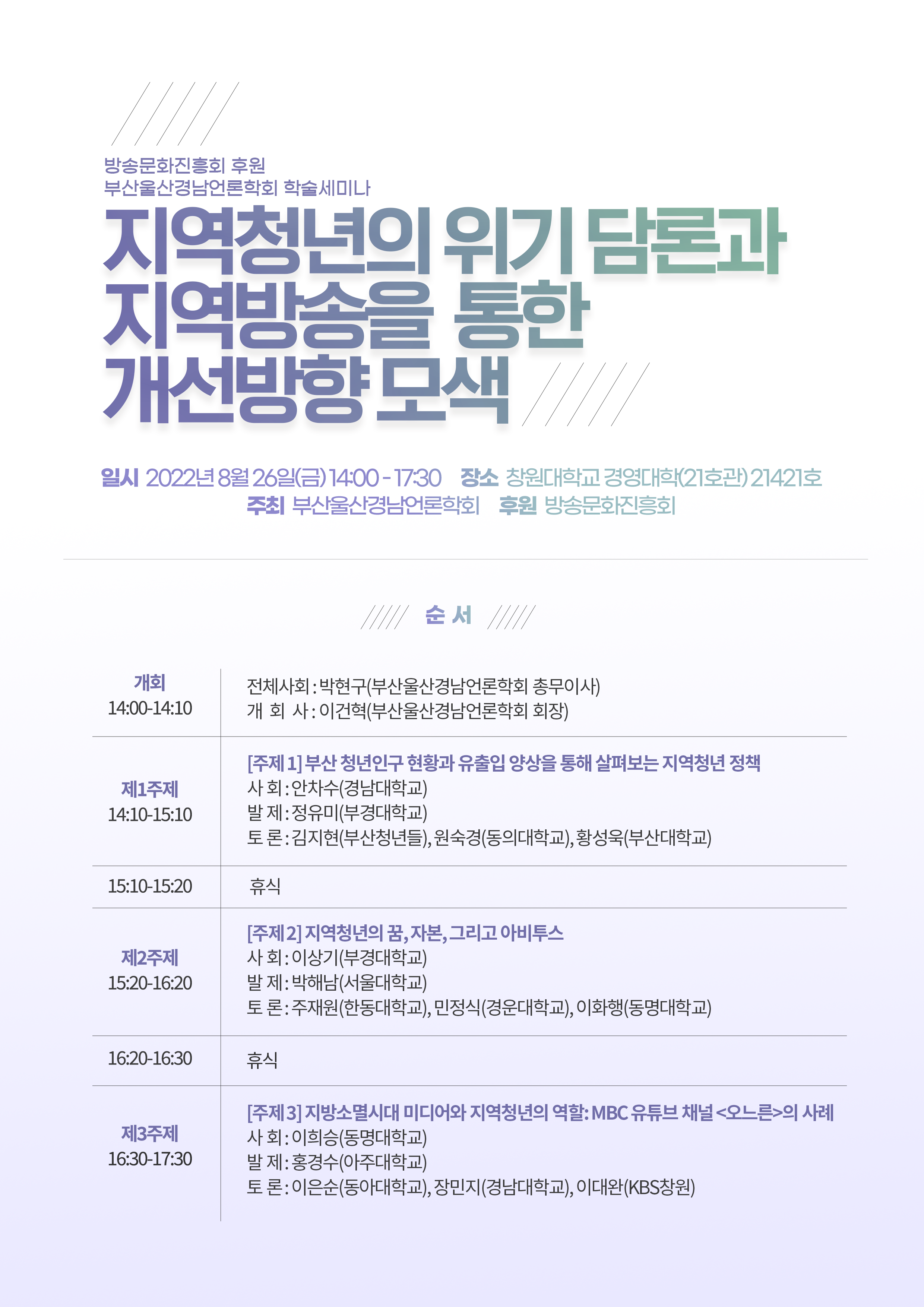 2. 방송문화진흥회의 후원으로 부산울산경남언론학회가 주최하는 <지역청년의 위기 담론과 지역방송을 통한 개선방향 모색> 학술세미나가 다음과 같이 826() 창원대학교에서 개최됩니다회원님들의 많은 관심과 참여를 부탁드립니다.