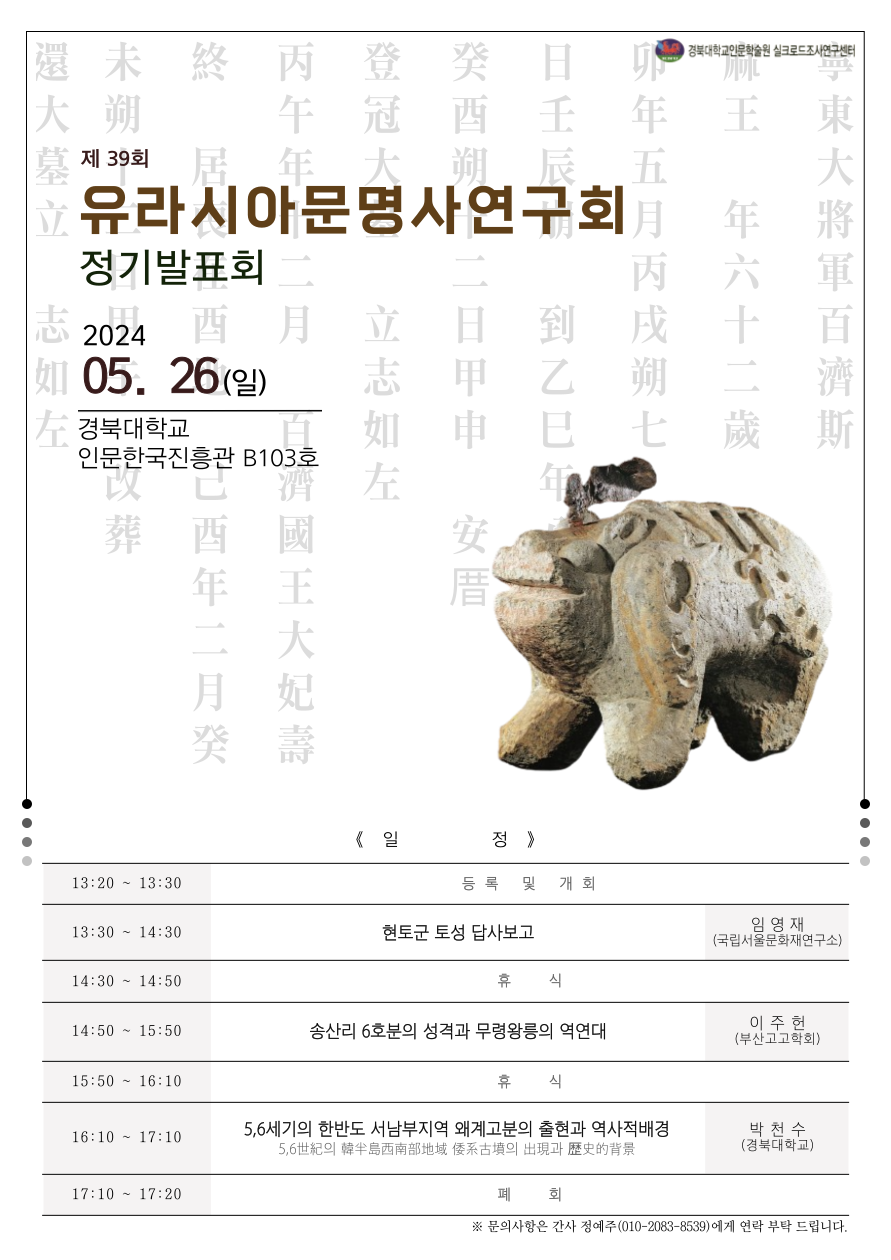 2024년 5월 26일 일요일, 유라시아문명사연구회 제 39회 정기발표회가 진행될 예정입니다.