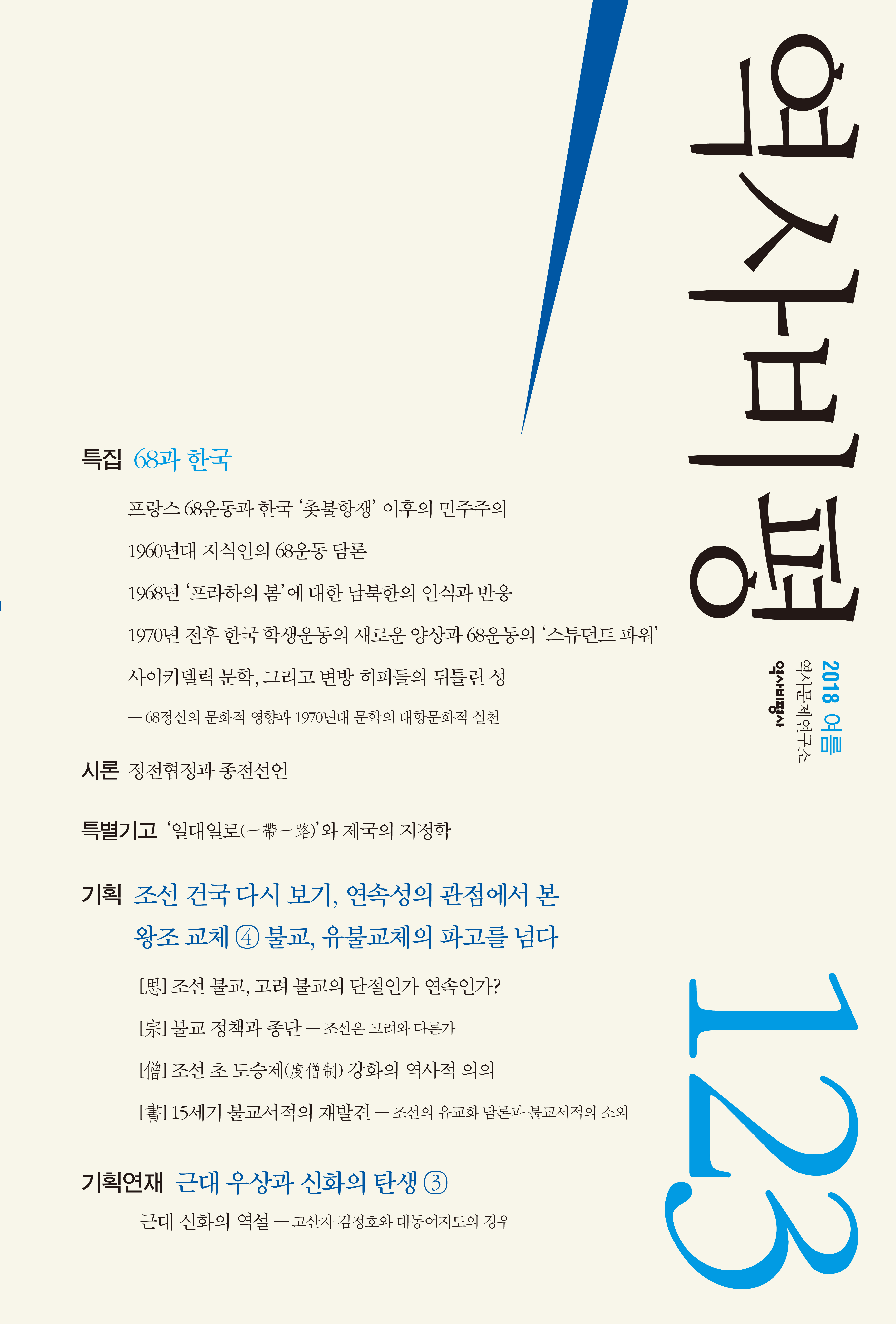 ‘조선 건국 다시 보기’ 기획은 이번호에도 계속된다. 시간을 다루는 학문으로서 역사학의 가장 중요한 임무이면서도 가장 어려운 일이 바로 시대구분이다. 『역사비평』은 이번호까지 네 번에 걸쳐 시대구분의 기준으로 조선 건국에 대한 쟁점들을 다루었다. 『역사비평』이 실은 글들은 사건의 역사적 의미에 대한 논쟁이라기보다, 14~15세기의 연속과 변화에 대한 새로운 성찰이었다. 이번호는 불교가 주제이다. 필자들은 정치이념과 시대사조가 유교로 전환하고 있음에도 불구하고, 이 시기 불교의 사상과 신앙, 제도에서는 연속성이 유지되었다고 본다. 김용태는 사상과 신앙의 영역에서, 박광연은 불교 정책과 종단 운영의 측면에서 이 문제에 접근했다. 기존의 통념과 다른 ‘승려’ 집단의 사회적 실체에 접근하면서 대불교 정책의 연속성을 고찰한 양혜원의 논문도 흥미롭다. 손성필은 15세기 서적 간행을 재검토하여 유교화를 합리화라고 이해하는 기존 관행을 비판하면서, 불교 제도와 전통의 연속성이라는 측면을 강조한다.
