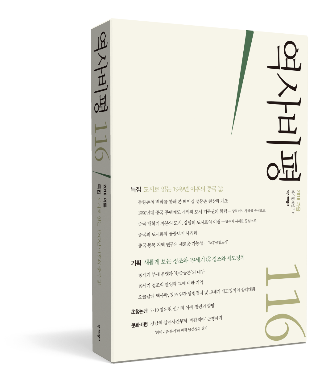 「역사비평」 2016년 가을호. 이번호 특집은 지난호에 이어 중국을 읽는 새로운 키워드로서 '도시'에 집중하고 있다. 이번 특집은 과거의 틀에 박힌 중국 상(像)을 되풀이하거나 익숙한 담론을 재탕하는 기획이 아니다. 각자 수많은 현지조사로 연구의 바탕을 튼튼히 다진 중국학 연구자들이 모여 어디서도 보여주지 않았던 '중국'이라는 나라의 현재 모습을 성실히 그려내고, 이를 통해 미래를 내다보고 있다.