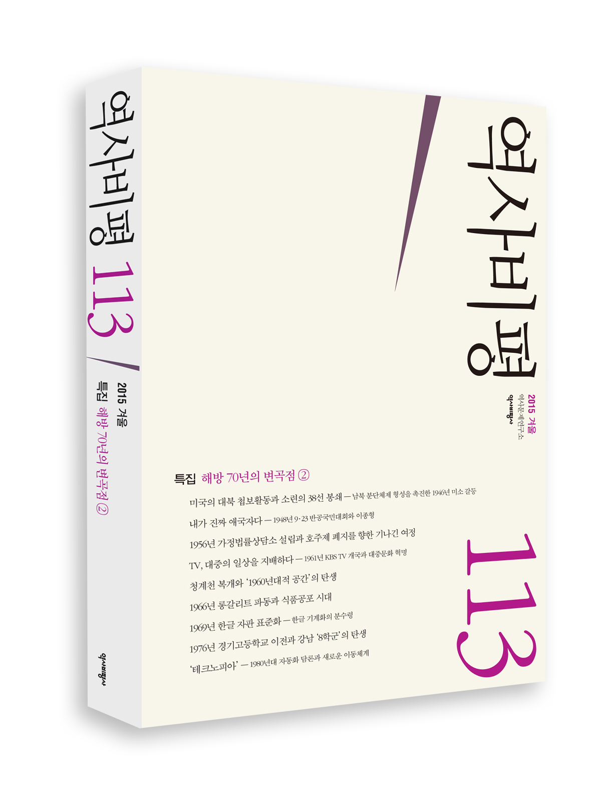 「역사비평」 2015년 겨울호. 지난호에 이어 두 번째로 구성된 특집 '해방 70년의 변곡점'은 그동안 한국 현대사 연구에서 때때로 언급은 되었지만, 독자적으로는 조명 받지 못했던 주제들을 찾고자 했다. 분단과 전쟁, 독재와 민주화처럼 거시적인 주제는 아니지만, 각 시대에 중요한 변화를 가져왔던 사건들을 통해 한국사회가 1945년 이후 지난 70년 동안 걸어왔던 길을 재조명하고자 했다.