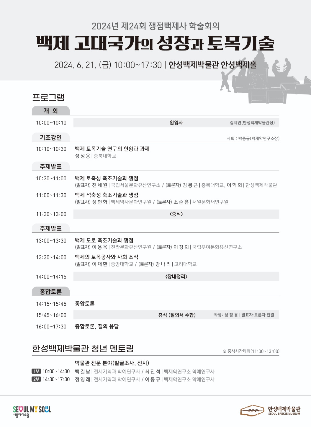 이번 학술회의 당일에는 학술회의와 병행하여 '한성백제박물관 청년 멘토링'을 실시합니다. 학예연구사 2명이 멘토가 되어 박물관 전문분야(발굴조사, 전시)에 대한 멘토링을 진행합니다. 관심있는 대학(원)생은 누구나 멘티가 될 수 있습니다.