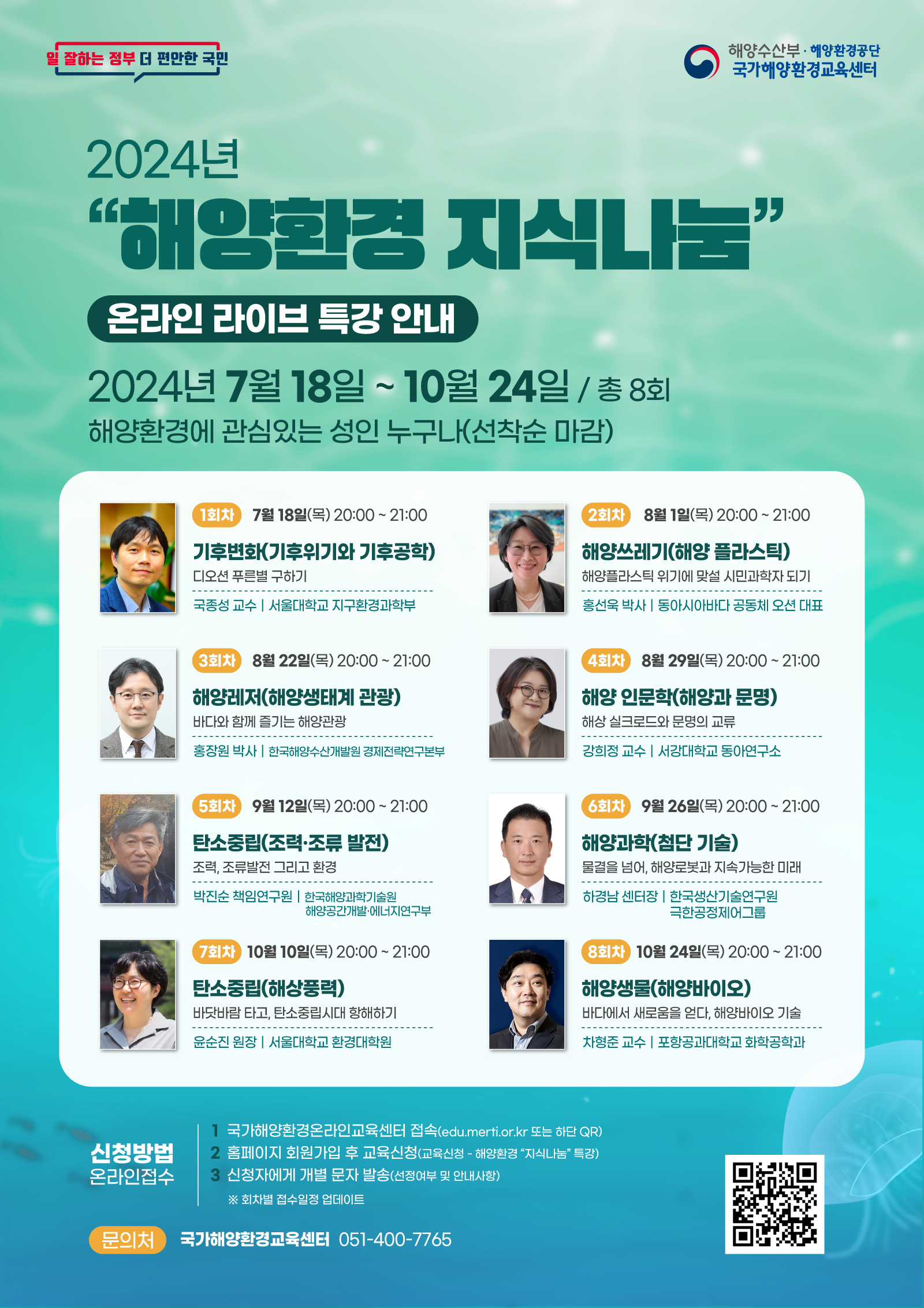 본 특강의 내용, 신청방법 등 보다 자세한 사항은 국가해양환경교육 온라인 교육센터(edu.merti.or.kr) 또는 전화(051-400-7765)로 문의주시면 됩니다.