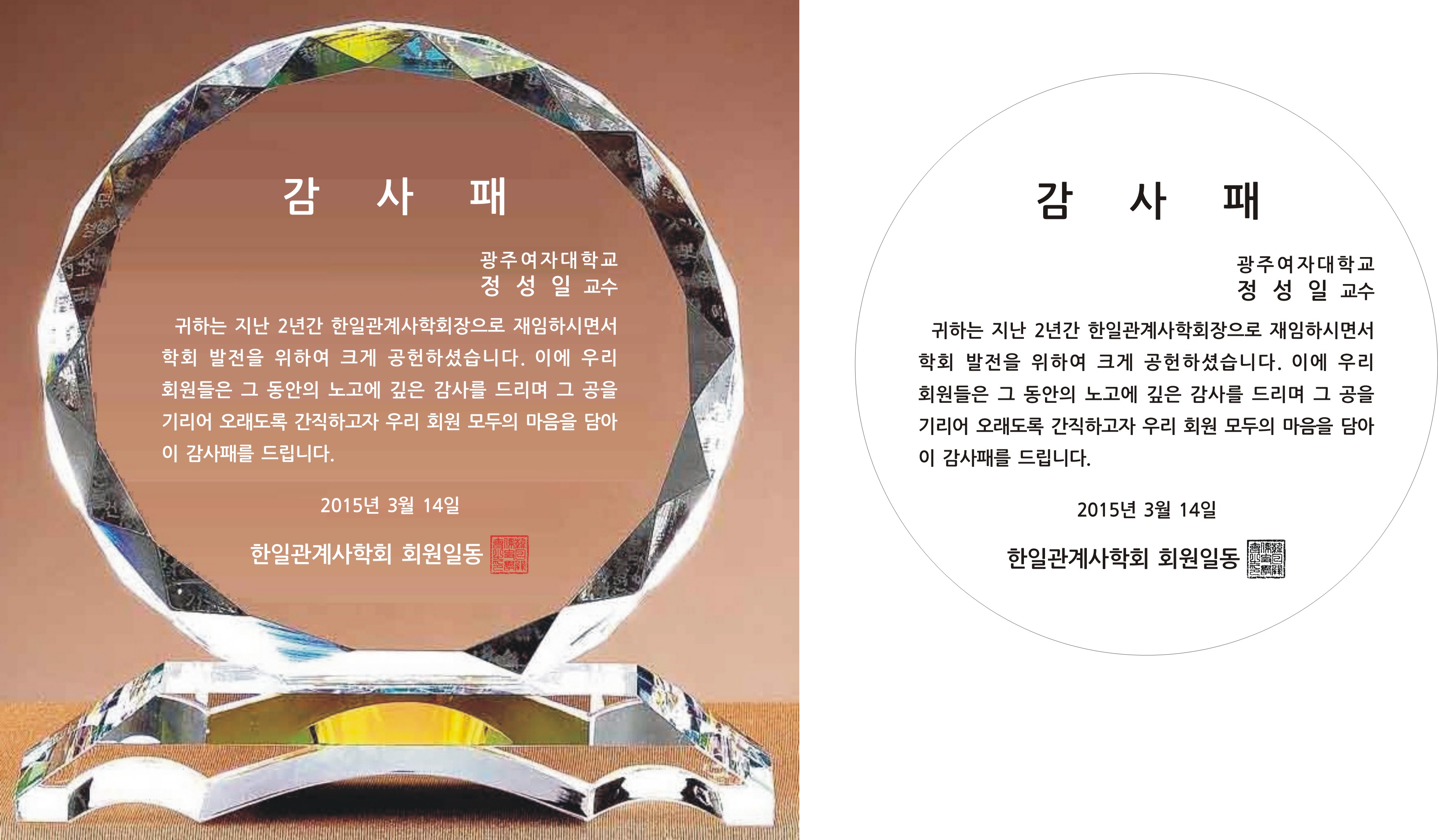 2013~14년도에 회장으로서 봉직한 정성일 선생님의 공로를 기려서 공로패가 주어졌습니다. 전달은 2015년 3월발표회 때에 이뤄졌습니다.