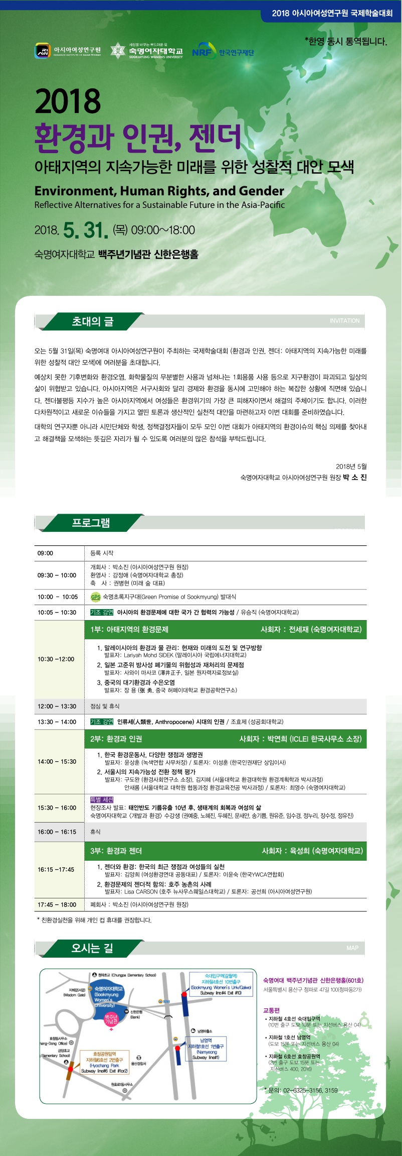 [국제학술대회] 환경과 인권, 젠더: 아태지역의 지속가능한 미래를 위한 성찰적 대안 모색 (Environment, Human Rights, and Gender: Reflective Alternatives for a Sustainable Future in the Asian-Pacific Region)