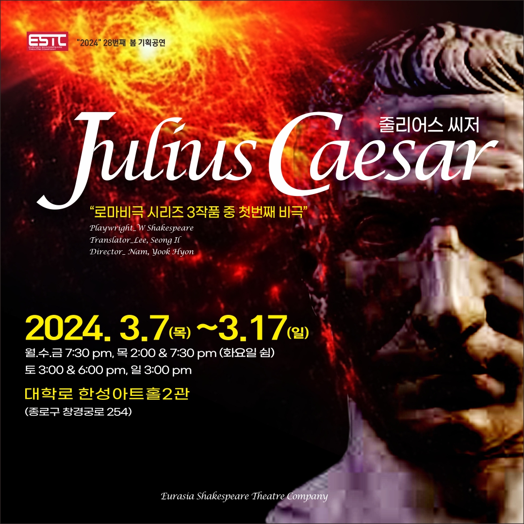 2002년 창단 공연부터 연속해서 10년 이상 국내초연작 공연들만 15편 정도를 공연해왔던 ESTC가 2024년 3월 7일 목요일부터 3월 17일 일요일까지 셰익스피어의<줄리어스 시저>를 극단 창단 22주년 새봄 시즌을 맞아 대학로 부근 (혜화역 4번출구 혜화로타리 근처) 서울 종로구 창경궁로 254 에 위치하여 접근이 쉽고 기다리는 관객을 위한 극장 로비 등 비교적 시설이 좋은 극장 한성아트홀2관에서 올리게 되었습니다.
