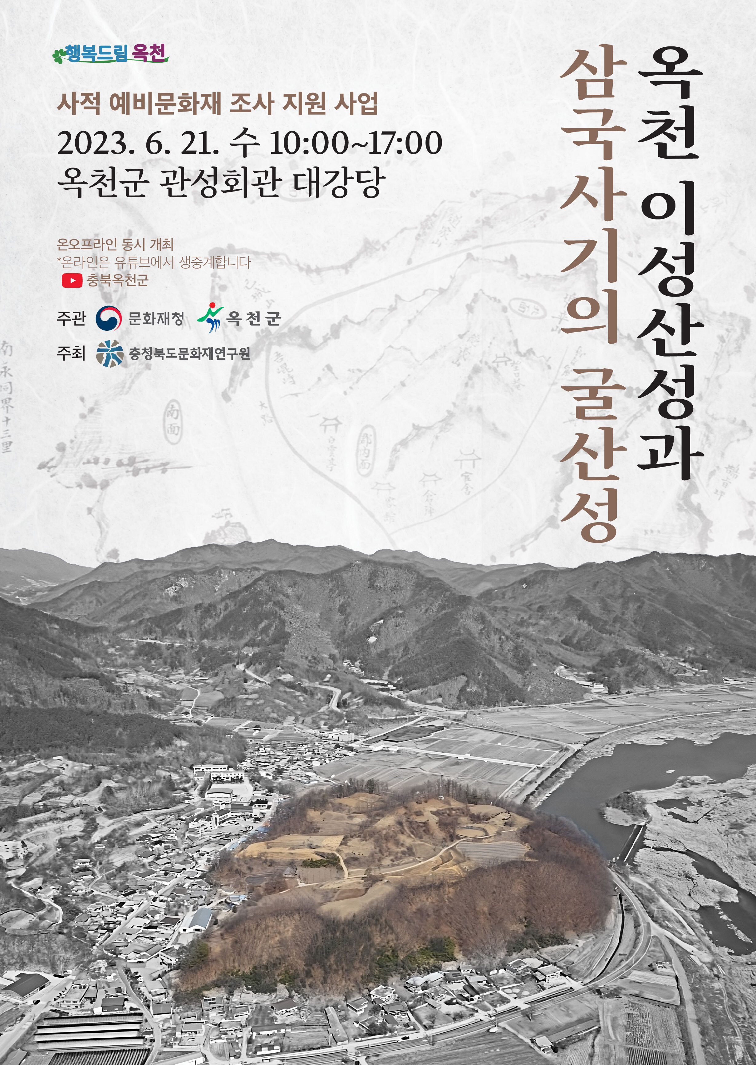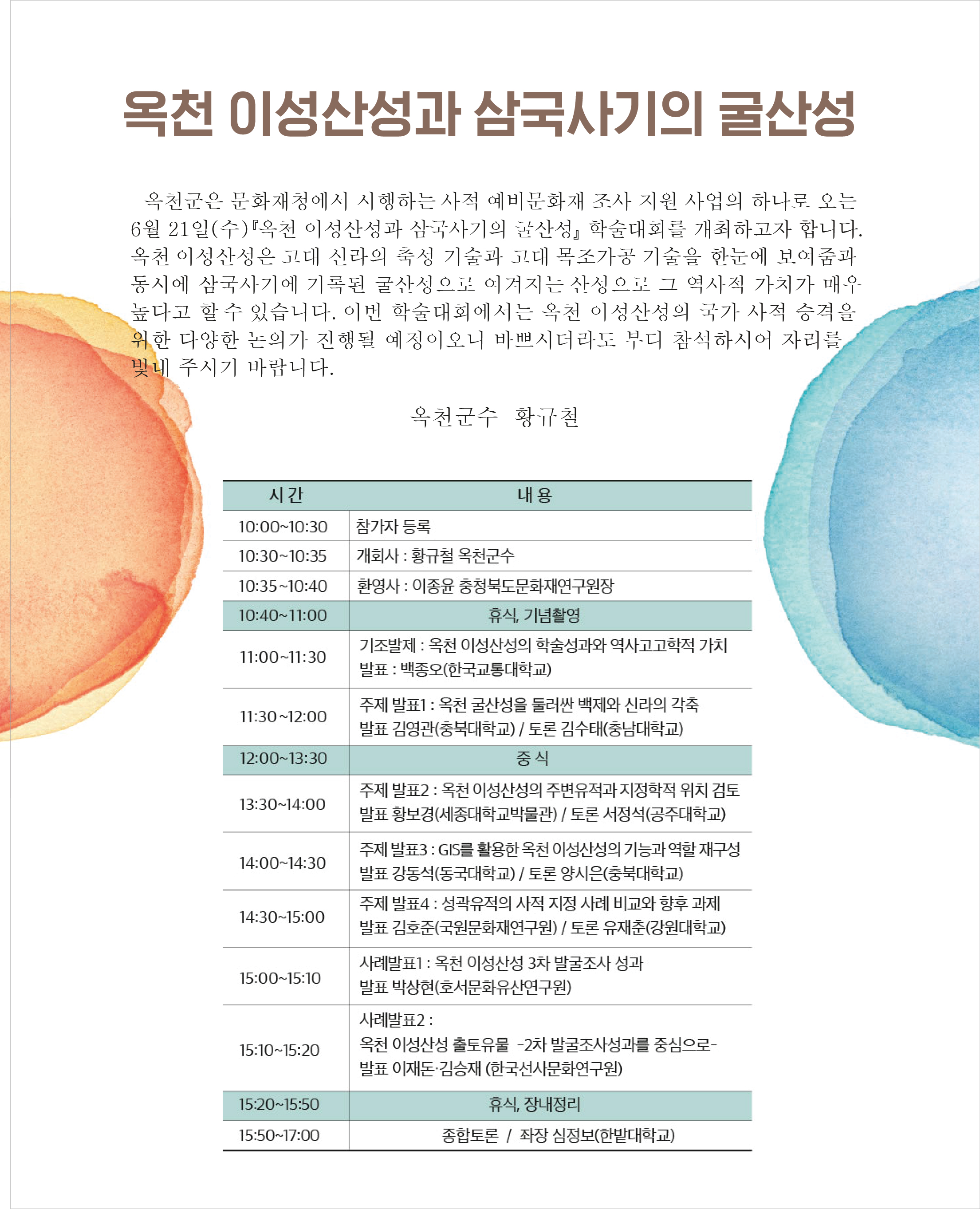 옥천군은 문화재청에서 시행하는 사적 예비문화재 조사 지원 사업의 하나로 오는 621() 옥천 이성산성과 삼국사기의 굴산성학술대회를 개최하고자 합니다. 옥천 이성산성은 고대 신라의 축성 기술과 고대 목조건물 기술을 한눈에 보여줌과 동시에 삼국사기에 기록된 굴산성으로 비정되는 산성으로 그 역사적 가치가 매우 높다고 할 수 있습니다. 이번 학술대회에서는 옥천 이성산성의 국가 사적 승격을 위한 다양한 논의가 진행될 예정이오니 바쁘시더라도 부디 참석하시어 자리를 빛내 주시기 바랍니다.