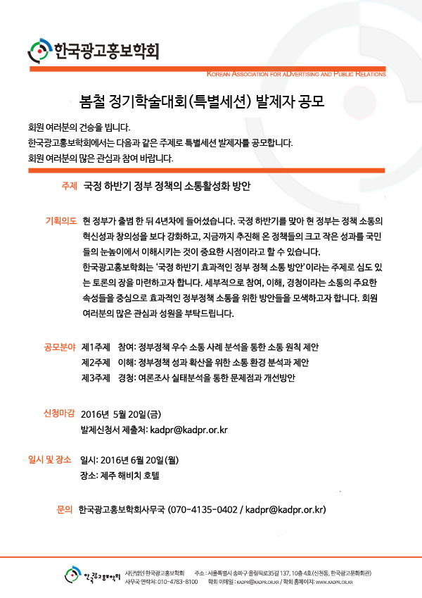 [KADPR]한국광고홍보학회 봄철 정기학술대회 특별세미나 발제자 공모<국정 하반기 정부 정책의 소통활성화 방안>