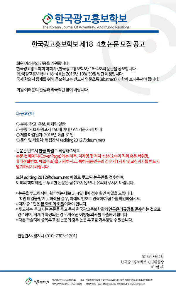 [KADPR] <한국광고홍보학보> 제 18-4호 논문 모집 공고