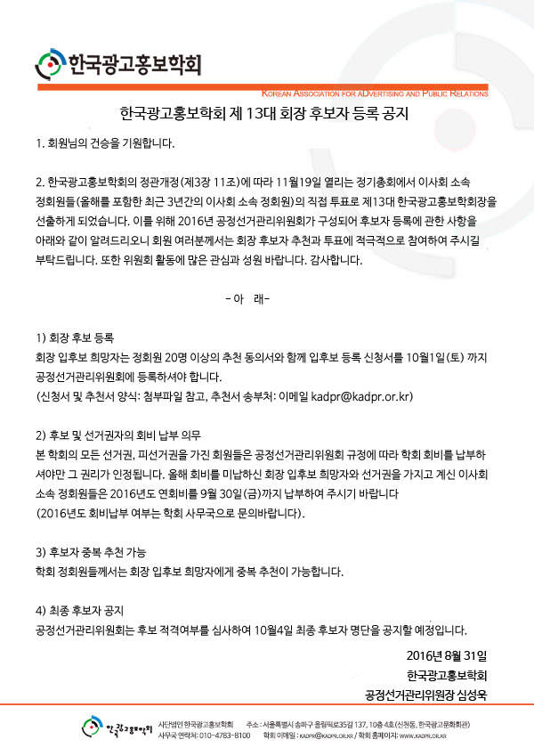 [KADPR]한국광고홍보학회 제 13대 회장 후보자 등록 공지