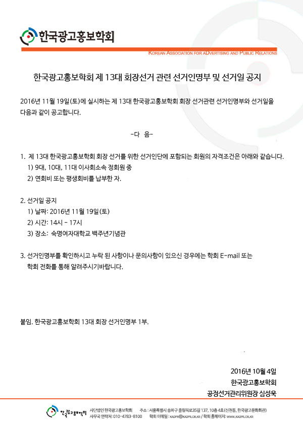 [KADPR]한국광고홍보학회 제 13대 회장 선거관련 선거인명부 및 선거일 공지