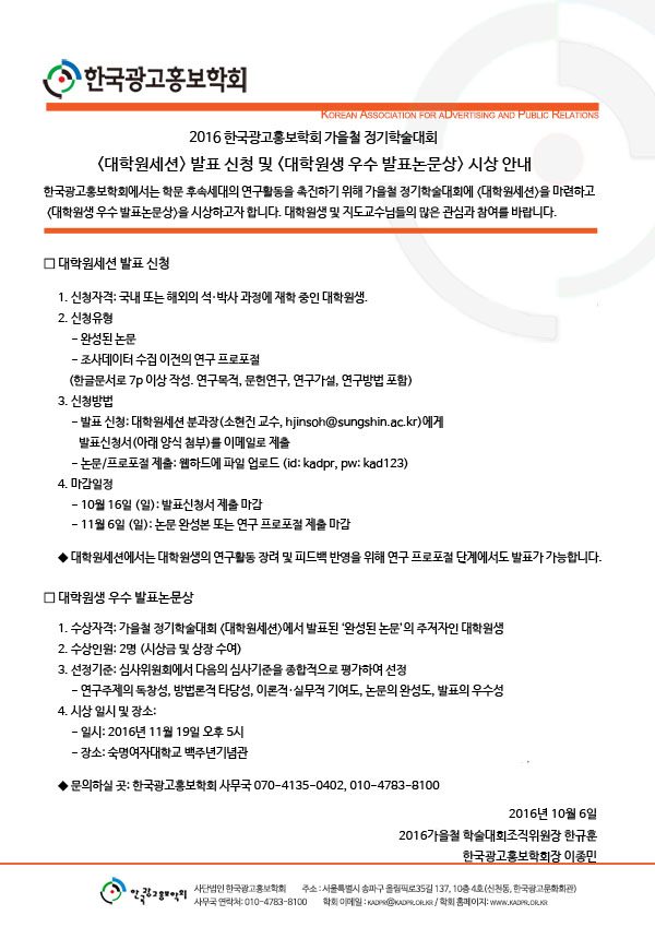 [KADPR]정기학술대회 대학원세션 발표신청 및 우수발표논문상 시상안내