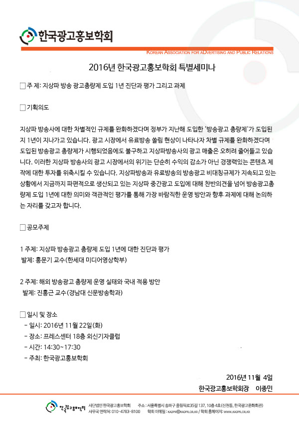 [KADPR]11월22일 한국광고홍보학회 특별세미나 발제자 선정 공지