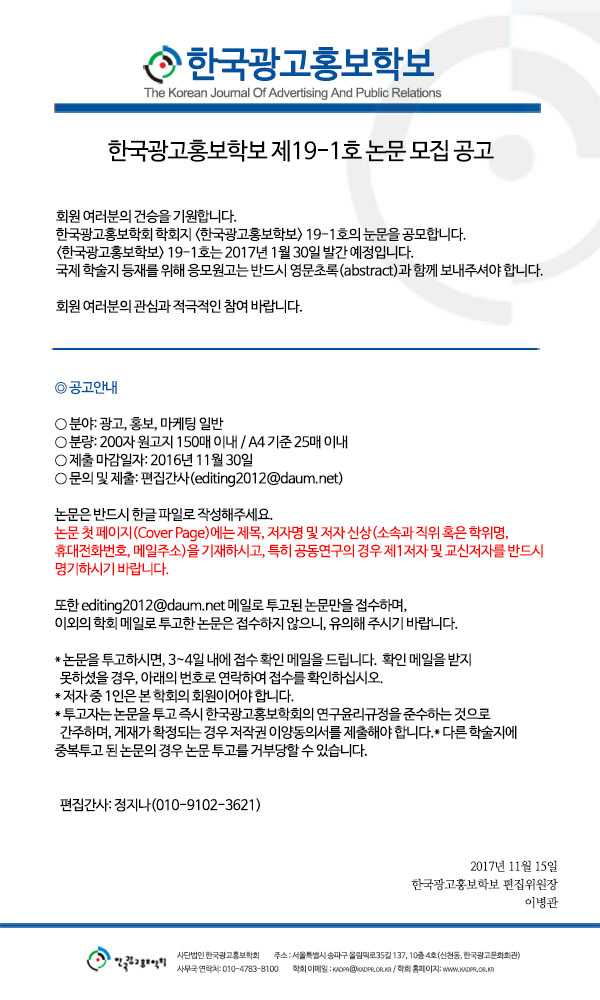[KADPR] <한국광고홍보학보> 제 19-1호 논문 모집 공고