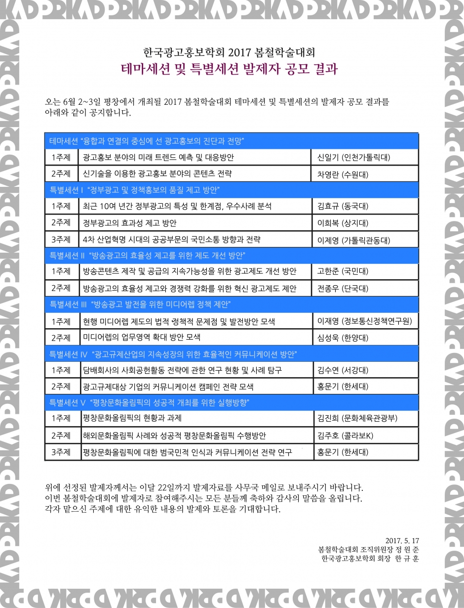 [KADPR] 2017 봄철학술대회 테마세션 및 특별세션 발제자 공모 결과