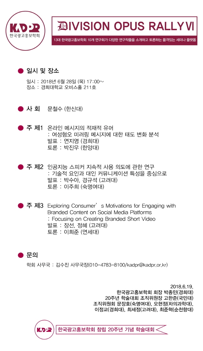 [KADPR] 창립 20주년 기념 학술대회 DIVISION OPUS RALLYⅥ 세션 안내