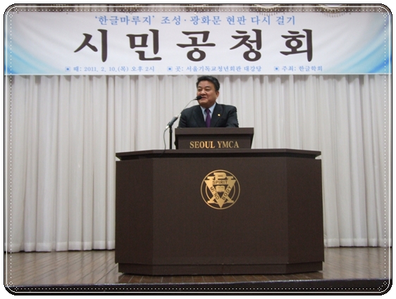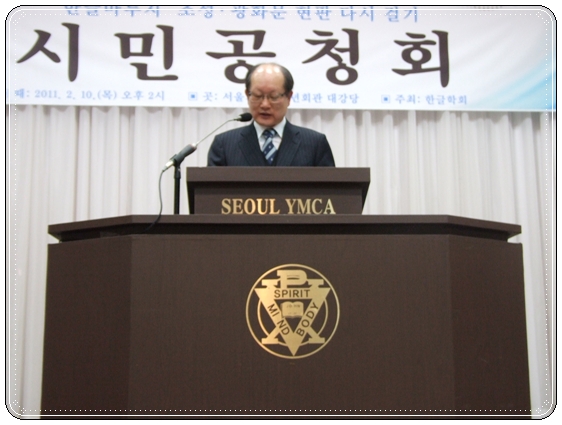 ▲ 2011년 2월 11일 오후 2시부터 서울기독교청년회관(YMCA, 종로2가) 대강당에서 열린 '한글마루지 조성/광화문 현판 다시 걸기 시민 공청회'의 모습. 기조 발언을 하고 있는 권재일 국립국어원 원장(위 사진)과 안창원 서울기독교청년회 회장(아래 사진)의 모습.