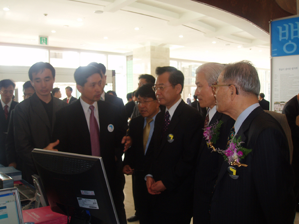 2005년 10월 9일 (일) 오전 10시부터 국립극장에서 있었던 559돌 한글날 기념 전시회를 둘러 보고 있는 한 모습입니다. 사진은 정동채 문화관광부 장관(오른쪽에서 세 번째)과 한글 학회 김계곤 회장(오른쪽에서 첫 번째), 세종대왕기념사업회 박종국 회장(오른쪽에서 두 번째) 등 행사 참석자들이 전시 설명을 듣고 있는 모습입니다. <찍은 이: 꿈돌이(2005.10.9.)>