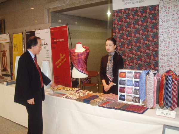 2005년 10월 6일 (목) 오후 2시부터 국회 국회의원회관 대회의실에서 있었던 한글인터넷주소추진총연합회 주최 제2회 한글 문화 정보화 포럼 행사의 한 모습입니다. 사진은, 내사랑코리아에서 한글무늬로 만든 넥타이, 목도리 등 한글 문화 상품을 전시하고 있는 모습입니다. <찍은 이: 꿈돌이(2005.10.6.)>