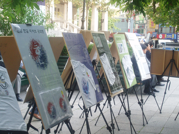 2005년 10월 5일 (수) 오전 11시부터 서울 세종문화회관 분수대광장에서 있었던 한글날 기념 '한글무늬옷(한글티셔츠) 공모 작품 전시와 나눠주기' 행사의 한 모습입니다. <찍은 이: 꿈돌이, 2005년 10월 5일.>
