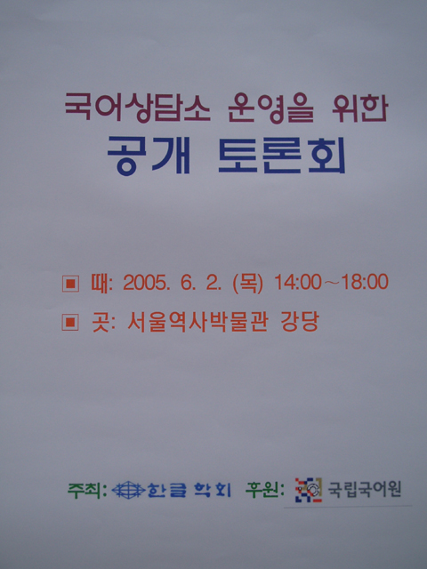 2005년 6월 2일 (목) 오후 2시부터 서울역사박물관 강당에서 있은 '국어상담소 운영을 위한 공개 토론회' 안내판. <찍은 이: 꿈돌이, 2005. 6. 2.>