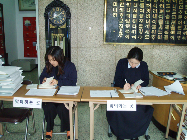 2005년 3월 26일 (토) 오후 2시부터 한글 회관 강당에서 있은 '2005년도 한글 학회 평의원회/정기총회'에 앞서 1층 현관에서 회원들을 맞이하고 있는 모습니다. (찍은 이: 꿈돌이, 2005년 3월 26일.)