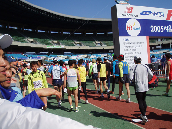 2005년 3월 13일 (일) 아침, '2005서울국제마라톤대회 겸 제76회동아마라톤대회에서 등에 '한글날을 국경일로' 등판 딱지를 붙이고 출발지인 세종로에서 결승점인 잠실종합운동장까지 42.195㎞를 완주한 참가 선수들의 모습. 이 날 한글날국경일제정범국민추진위원회가 주최하고 한글학회, 세종대왕기념사업회, 외솔회, 한글인터넷주소총연합회가 후원하여 이 마라톤 대회에서 한글날 국경일 제정 추진을 위한 홍보 운동을 하였다. 새벽부터 한글 학회 직원들과 관련 단체 회원들, 김제에서 마라톤 대회에 참가하기 위해 올라 온 정 갑주 할아버지 외 20여 명 등 한글 사랑을 실천하는 이들은, 출발지인 세종로 세종문화회관 앞에서 마라톤 대회에 참가한 선수들의 등에 '한글날을 국경일로!'(가로 27.5×8.5㎝)라고 세긴 등판 딱지(스티커) 5,000장을 붙여 주거나 나누어 주었다. (찍은 이: 꿈돌이, 20050313.)