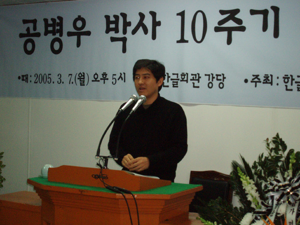 2005년 3월 7일 (월) 오후 5시에 한글 회관 강당에서 있은 공병우 박사 10주기 추모식에서 박 흥호(고누소프트 대표이사) 사장께서 아래아 한글의 탄생과 정보통신(IT) 관련 일을 도운 공 병우 박사님에 대한 이야기를 하고 있는 모습입니다. (찍은 이: 꿈돌이, 20050307.)