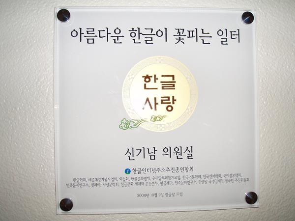 열린 우리당 신 기남 의원실에 들어가는 문 앞에 걸려 있는 '한글 사랑' 현판(찍은 이: 꿈돌이, 2005년 1월 28일 국회 의원 회관).