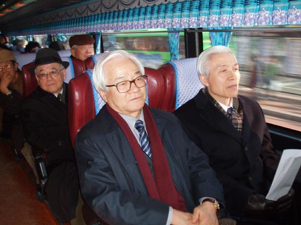 2005년 1월 26일 (수)에 모란공원 안 눈뫼 스승 무덤터(경기도 남양주시 화도읍 월산리)에서 가진 1주기 추모식을 마치고 돌아오는 버스 안의 모습. 외솔회 김 석득 회장(왼쪽)과 세종대왕기념사업회 박 종국 회장. (찍은 이: 꿈돌이, 2005년 1월 26일.)
