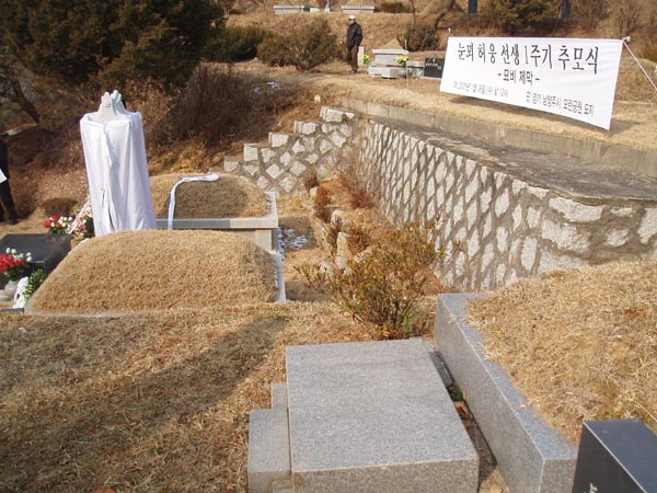 2005년 1월 26일 (수)에 모란공원 안 눈뫼 스승 무덤터(경기도 남양주시 화도읍 월산리)에서 묘비 제막식을 갖기 전의 모습. (찍은 이: 꿈돌이, 20050126.)