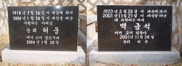 2005년 1월 26일 (수)에 모란공원 안(경기도 남양주시 화도읍 월산리)에 있는 눈뫼 허 웅 스승과 부인 백 금석 여사의 묘표. (찍은 이: 꿈돌이, 20050126.)