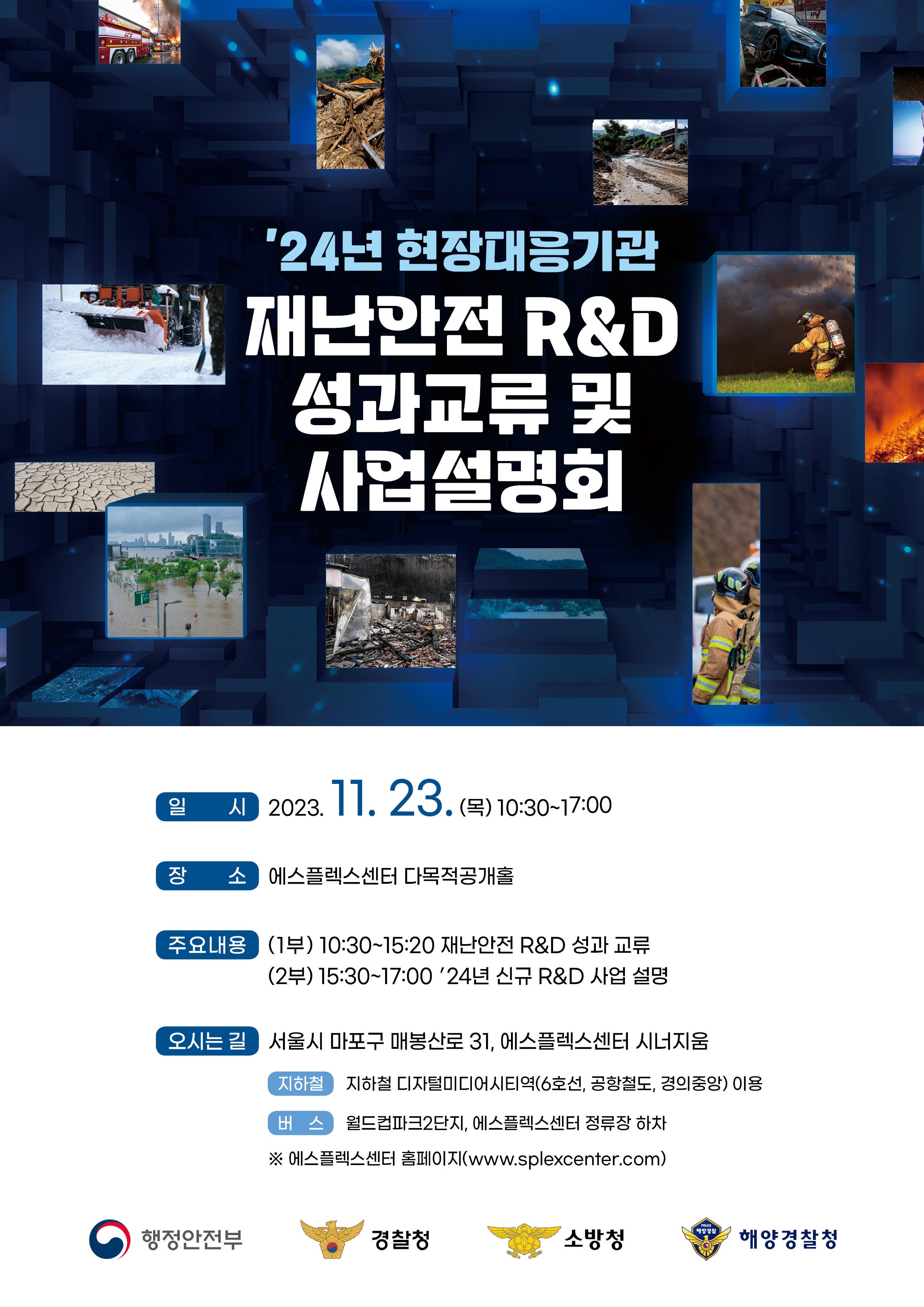 '24년 현장대응기관(행정안전부, 경찰청, 소방청, 해양경찰청) 재난안전 R&D 성과교류 및 사업설명회를 아래와 같이 개최하오니 재난안전 R&D 전문가분들의 많은 관심부탁드립니다.