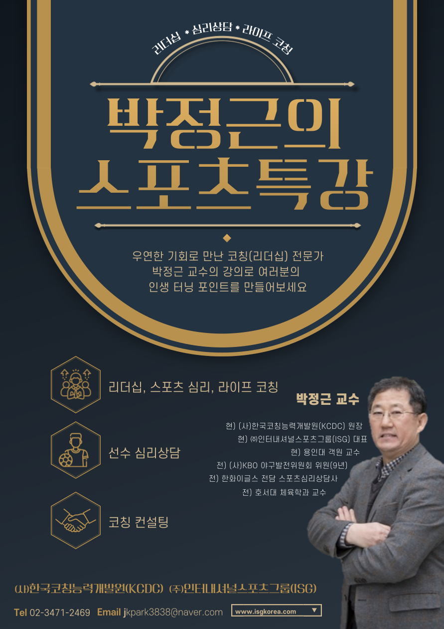 ()한국코칭능력개발원(KCDC) 박정근 원장님의 특강을 실시합니다. 우연한 기회로 만난 코칭(리더십) 전문가 박정근 교수의 강의로 여러분의 인생 터닝 포인트를 만들어보세요!