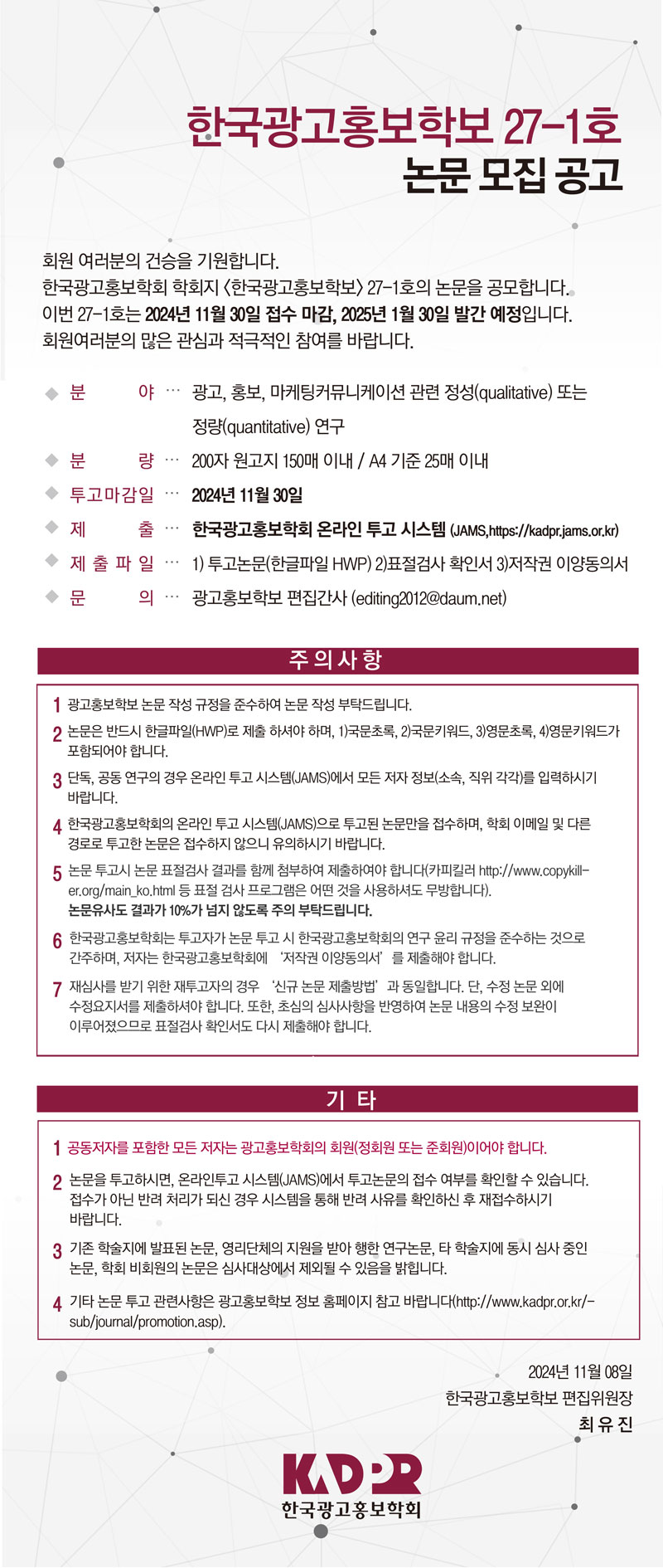 [KADPR] 한국광고홍보학보 27-1호 논문 모집 공고