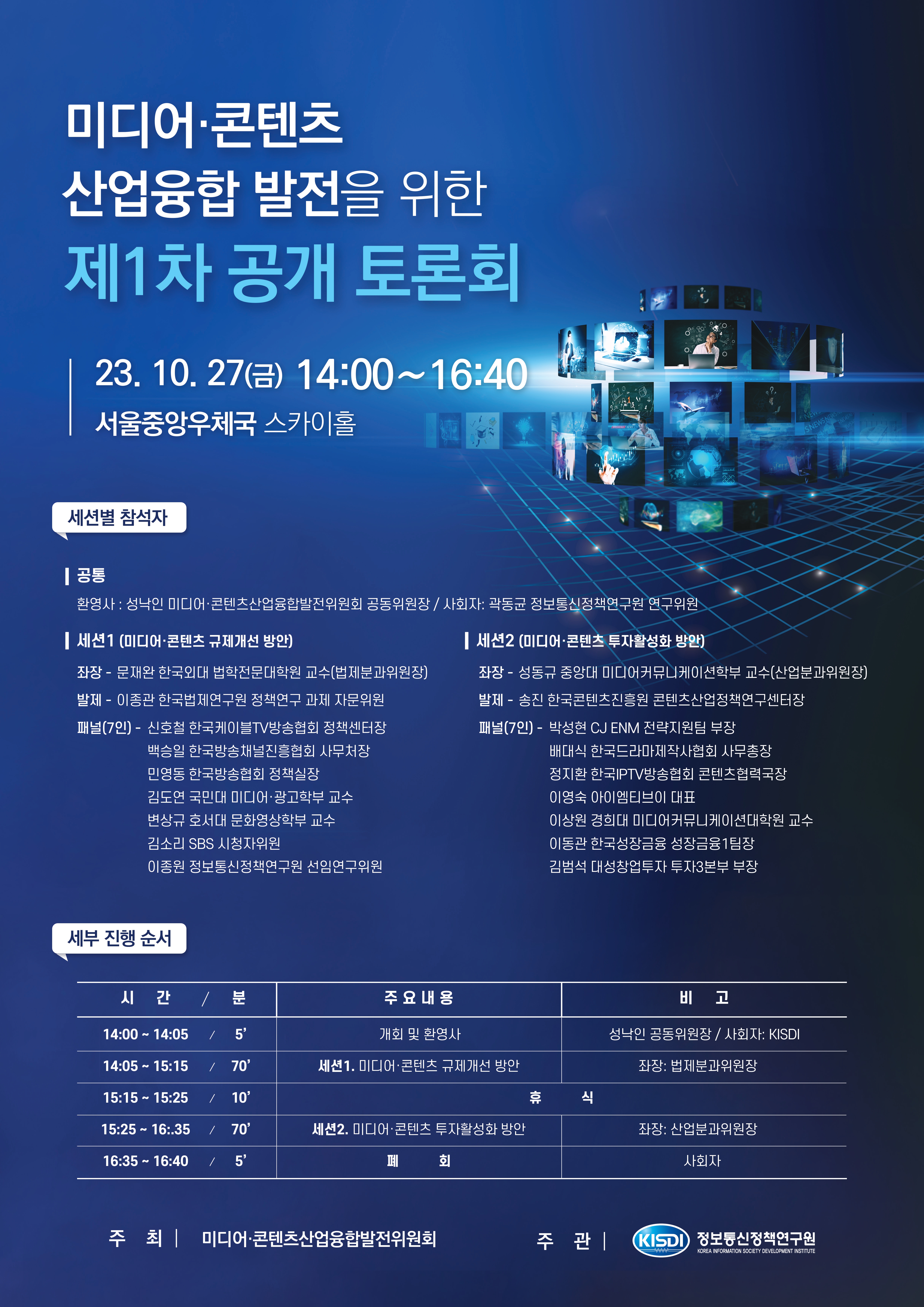 KISDI 연구원이 주관하고, 국무조정실 산하의 '미디어/콘텐츠산업융합발전위원회'가 주최하는 공개토론회를 안내합니다.