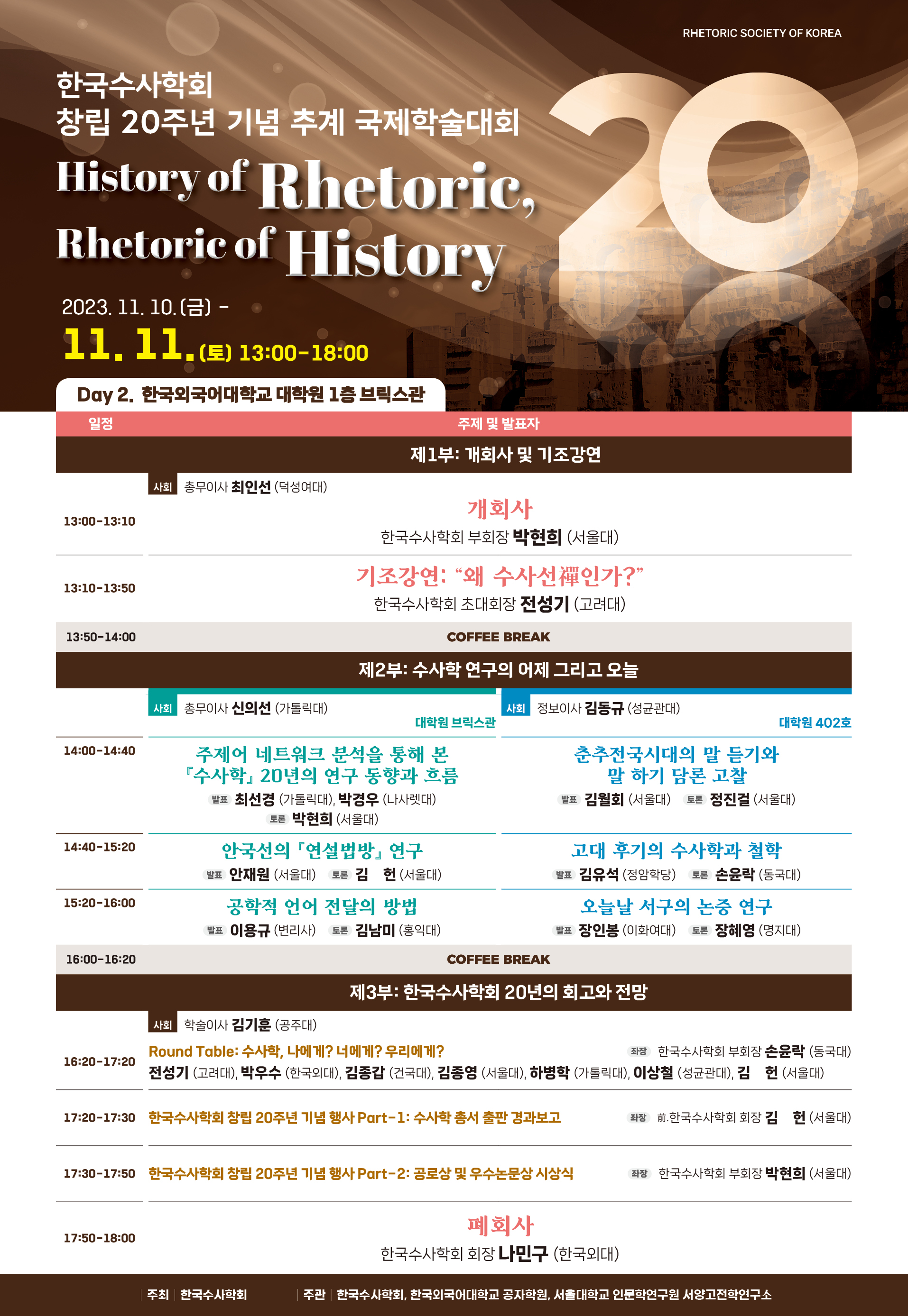 안녕하세요한국수사학회입니다아침저녁으로 가을의 정취가 한층 짙어지고 있는 요즘입니다올해로 창립 20주년을 맞는 한국수사학회(韓國修辭學會)는 이를 기념하고자 11월 10()~11(), 양일에 걸쳐 <한국수사학회 창립 20주년 기념 추계 국제학술대회>를 개최하고자 합니다이번 국제 학술대회의 대주제는 “History of Rhetoric, Rhetoric of History”(수사학의 역사역사의 수사학)입니다이는 고전·고대 수사학이 탄생한 이래로 다층적으로 변모해 온 이론적 지평과 실천적 장을 심도 있게 반추해 보기 위함입니다국내외 수사학 연구 전문가들이 발표를 맡아 한국수사학회의 역사는 물론수사학이라는 학문 자체의 역사에 대해서도 되짚어 보는 장이 될 것입니다.
