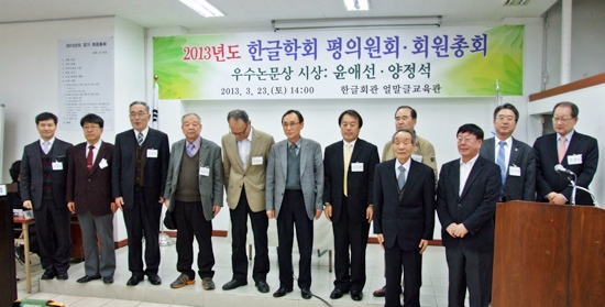 한글학회는 2013년 3월 23일(토)에 한글회관 얼말글교육관에서 아래와 같이 2013년도 정기 회원총회와 평의원회를 엽니다. 아울러 이번 회원총회에서 우수논문상 시상도 함께 합니다. 회원들께서는 모두 오셔서 학회 운영에 대한 좋은 의견을 나누어 주시고 우수논문상 수상자들에게도 격려와 축하해 주시기 바랍니다.