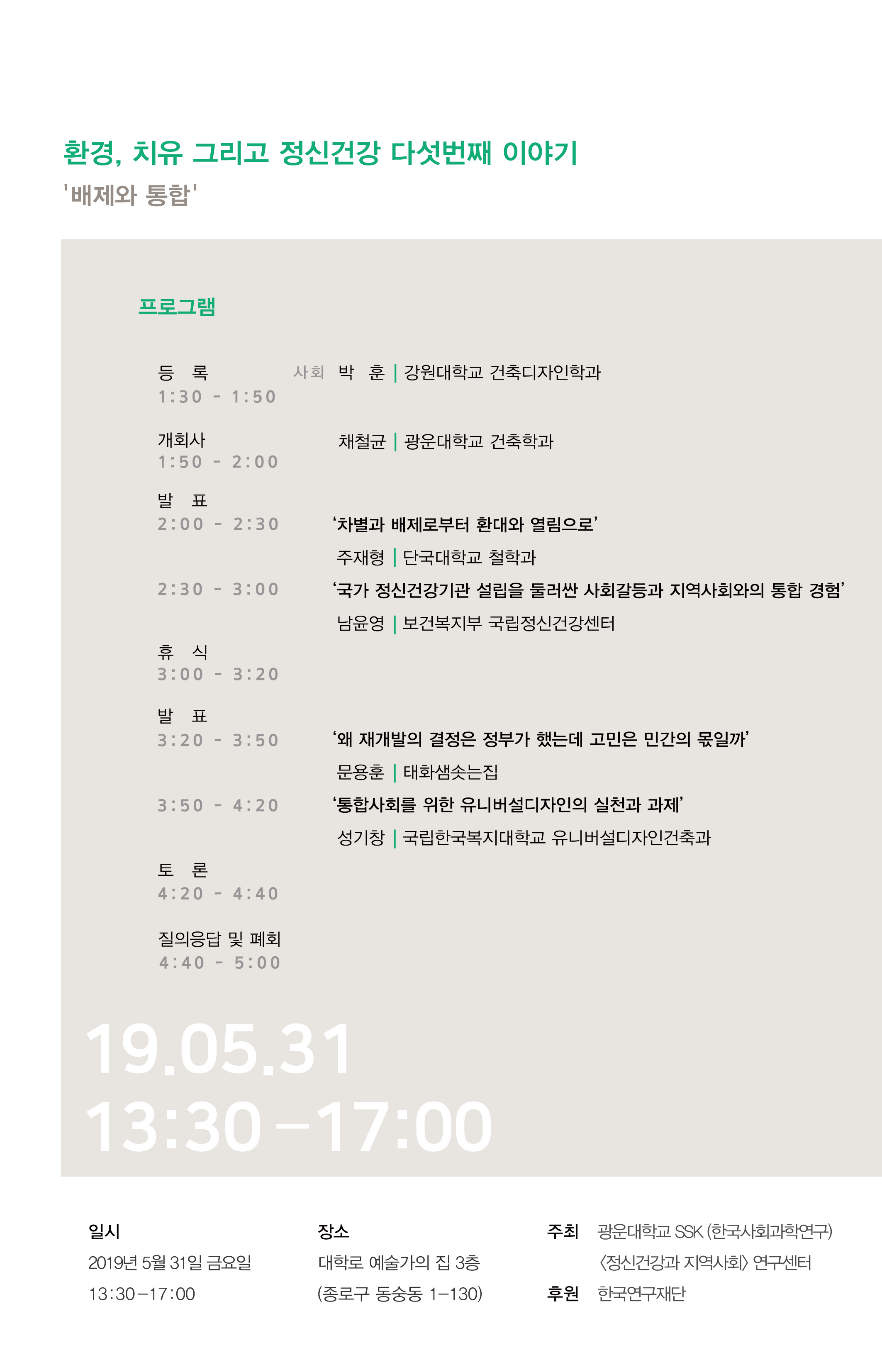 한국사회과학연구지원(SSK)사업의 일환으로 연구를 진행중인 '정신건강과 지역사회' 연구센터입니다. '환경, 치유 그리고 정신건강' 이라는 주제로 진행되는 심포지엄에 여러분들을 초대하고자 합니다. 이번 심포지엄은 벌써 다섯 번째를 맞이하고 있으며 <배제와 통합>이라는 주제로 이야기를 풀어나가고자 합니다.