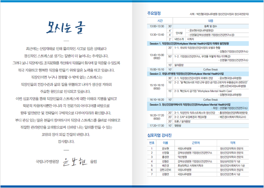 - 주최 : 보건복지부 국립나주병원, 강북삼성병원 기업정신건강연구소