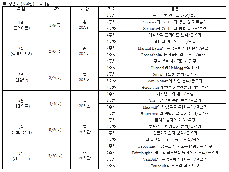 ○ 본 강좌는 질적연구 전통(근거이론, 생애사, 현상학, 사례연구, 문화기술지, 담론)의 고유한 특성과 분석정향을 고려하여 매월 한 강좌씩 상, 하반기 순환 개설됩니다.
