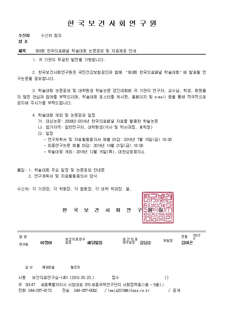제8회 한국의료패널 학술대회 논문공모 및 자료제공 안내 드립니다.