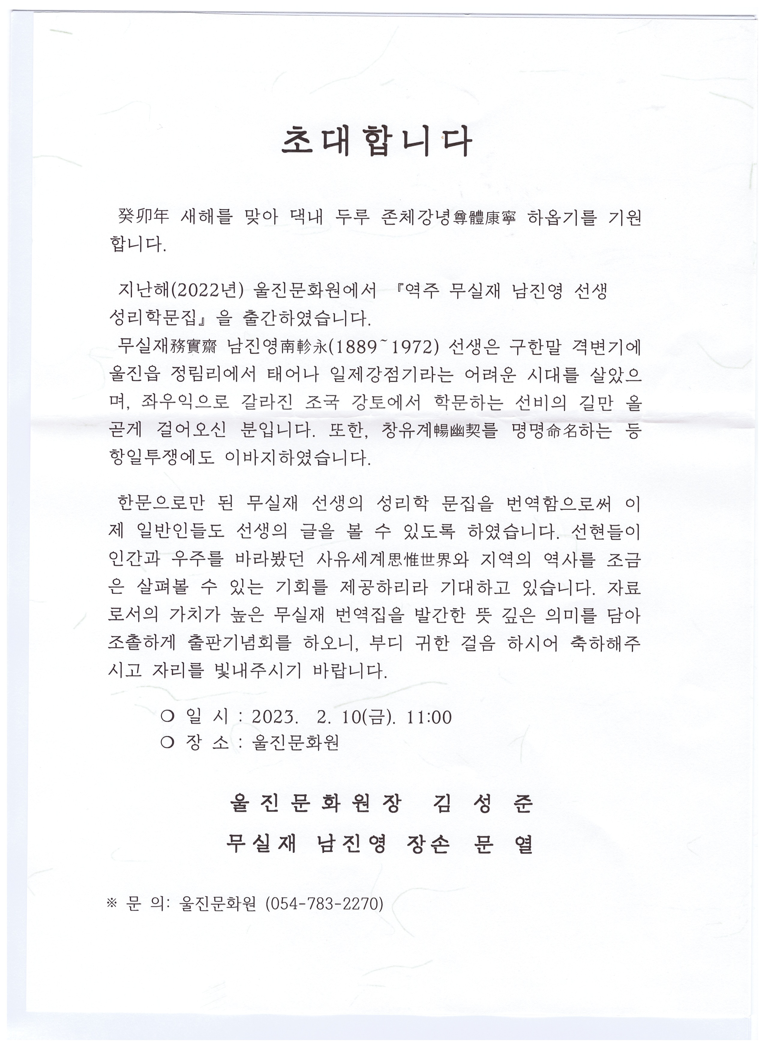 1889년 蔚珍에서 出生하시어 20대 후반부터 暀嶝島와 繼華島에서 艮齋先生께 修學하신 蔚珍출신의 艮門代表學者로서 1972년 逝世하실 때까지 儒學振興과 艮齋學을 계승발전을 위하여 진력하여오신 <務實齋南軫永先生文集飜譯出版紀念會>를 갖게 되었습니다.