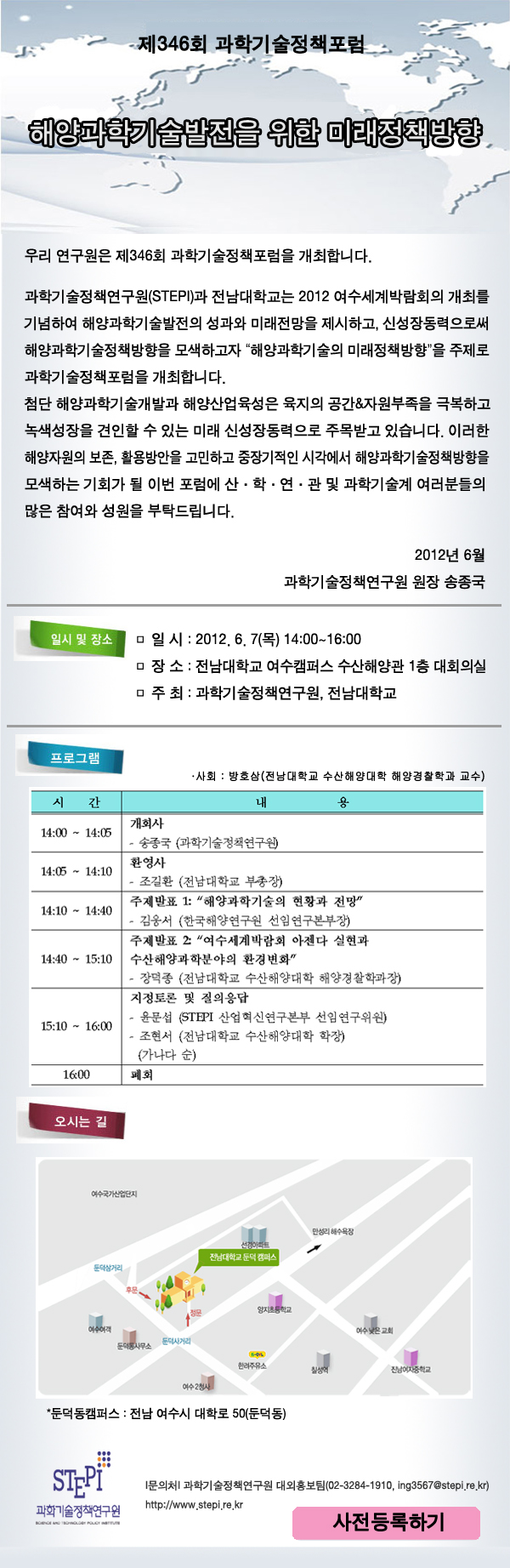 학기술정책연구원(STEPI)과 전남대학교는 2012 여수세계박람회의 개최를 기념하여 해양과학기술발전의 성과와 미래전망을 제시하고, 신성장동력으로써 해양과학기술정책방향을 모색하고자 해양과학기술의 미래정책방향 을 주제로 과학기술정책포럼을 개최합니다.