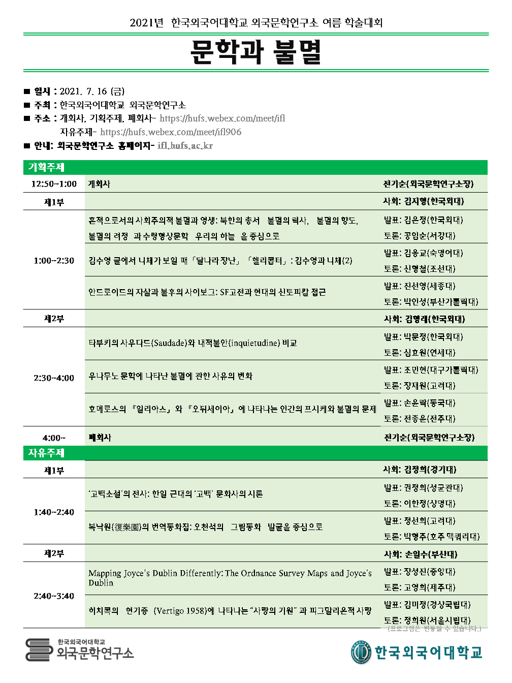 https://hufs.webex.com/meet/ifl  (개회사, 기획주제, 폐회사 오후 12시50분~)