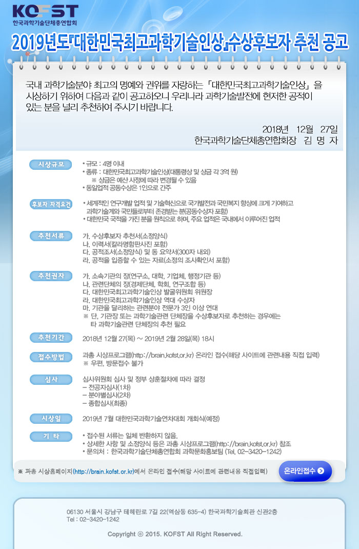 2019년도 대한민국최고과학기술인상 수상후보자 추천의뢰