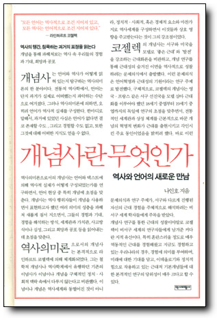최근 2~3년 사이, 한국 학계에서 주목받는 키워드 중 하나가 ‘개념사’이다. 그러나 그 동안 개념사 관련 책들은 개념사가 갖는 의미 자체보다는 ‘용어사’에 더 가깝거나, 전통적 이념사 혹은 관념사, 넓은 의미의 사상사를 새롭게 포장한 데 그쳤다. 그러나 이번 나인호 저자의 책은 개념사를 정초한 코젤렉에서부터 그의 한계를 비판적으로 극복하려 했던 다른 학자들에 이르기까지, 개념사의 문제의식이 더욱 정교화되고 날카로워지는 과정을 한눈에 확인할 수 있다.
