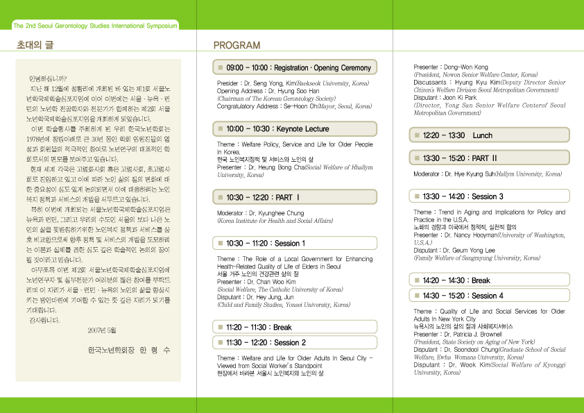한국 노년학회에서는 제2회 서울노년학국제심포지움을 개최합니다. 꼭 참석하셔서 좋은 의견 주시기 바랍니다.
