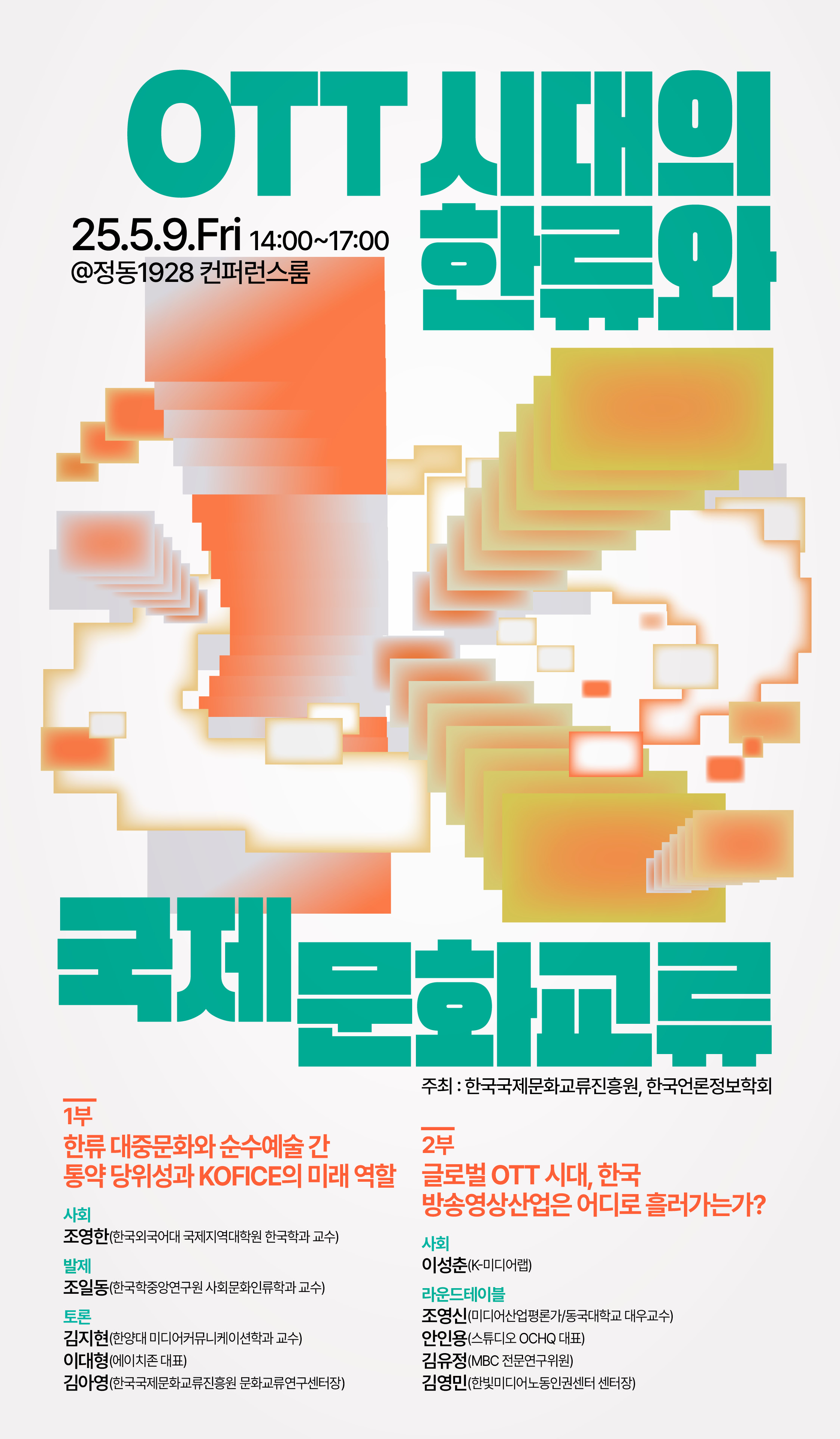 2. 한국언론정보학회가 2025년 5월 9일(금요일) <OTT시대의 한류와 국제문화교류>라는 제목으로 한국국제문화교류진흥원과 공동 세미나를 개최하오니, 회원 여러분의 많은 관심과 참여를 부탁드립니다.
