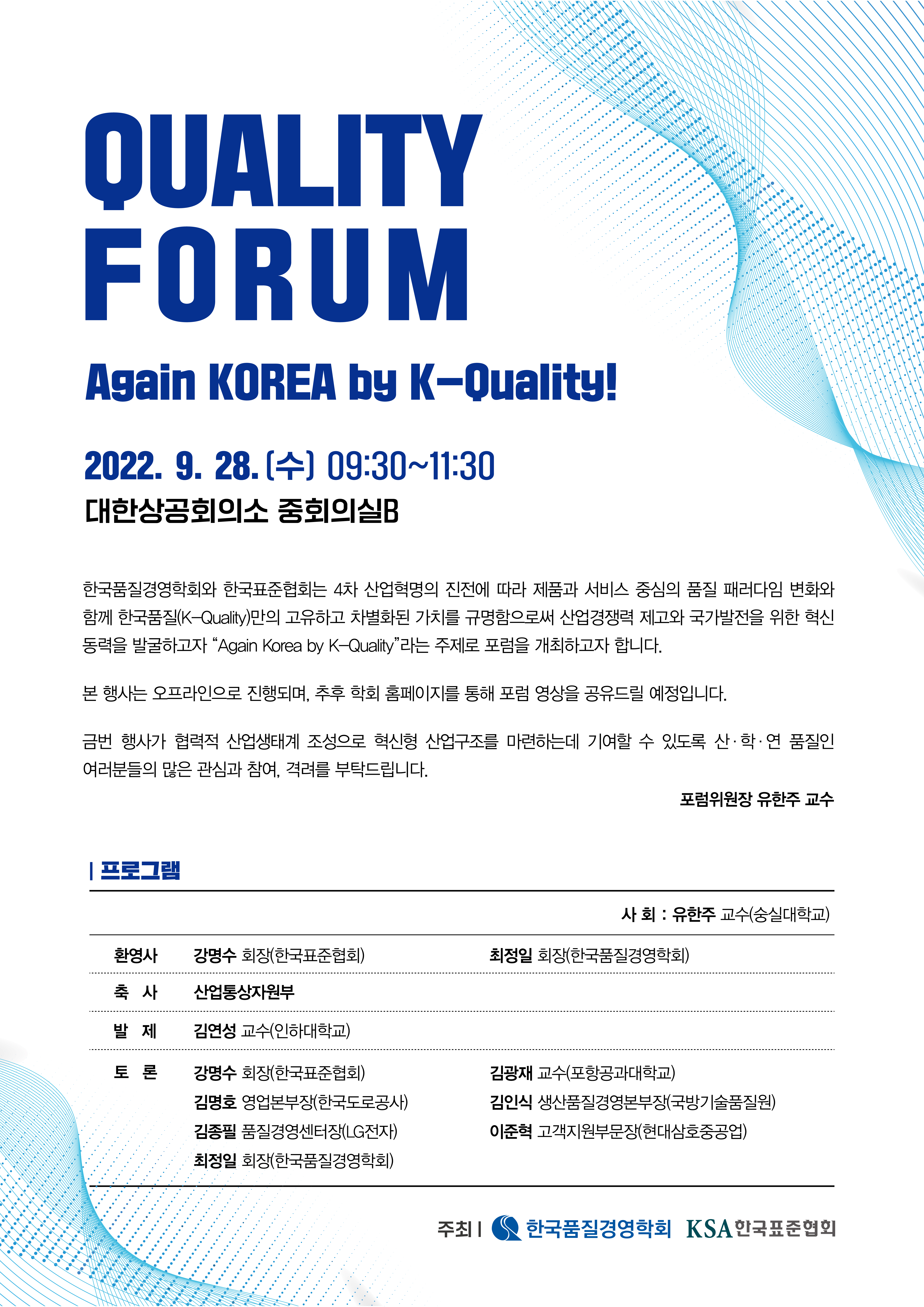 오는 9월 28일(수) 9시30분 대한상공회의소에서 한국품질경영학회와 한국표준협회는 4차 산업혁명의 진전에 따른 품질 패러다임의 변화와 함께 한국품질(K-Quality)만의 고유한 차별화된 가치를 규명함으로써 산업경쟁력 제고와 국가발전을 위한 혁신 동력을 찾고자 "Again Korea by K-Quality라는 제목으로 포럼을 개최하고자 합니다.